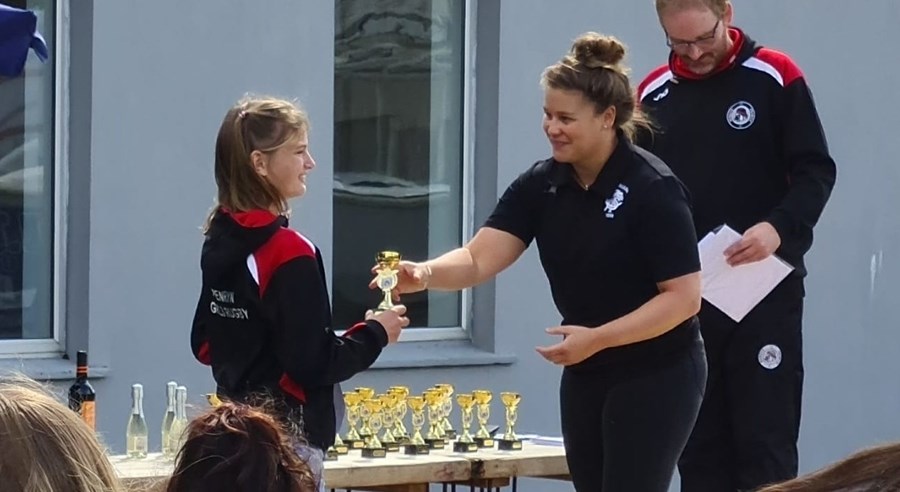 With the sun emerging during the preceding training session – the girls have been back at training since the first week of August under Penryn Rugby's comprehensive anti-Covid measures – the awards were able to be held outside in the Dugout Bar so that parents, players and even some of the league-winning Penryn Ladies could all listen to Georgina's experiences of the highest levels of female rugby, as well as answering plenty of questions from the socially-distanced attendees.